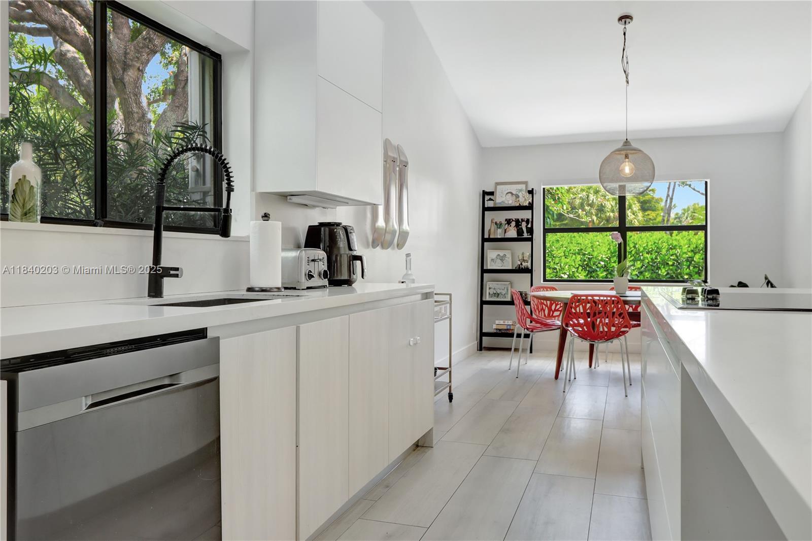 Step inside to an open-concept layout with soaring vaulted ceilings and high-end contemporary finishes throughout. The beautifully updated kitchen features top-of-the-line appliances, sleek cabinetry, and ample counter space—perfect for entertaining or enjoying daily meals in style.