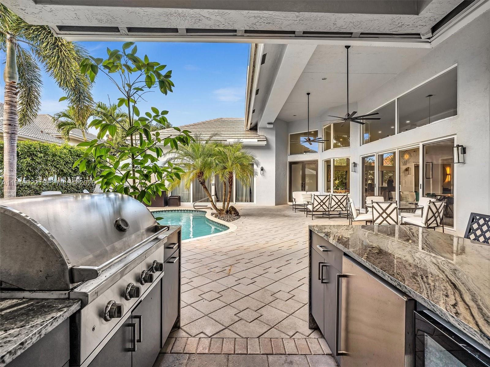 Kitchen: A fully updated chef's dream kitchen featuring quartzite countertops, a huge island, modern cabinetry, stainless steel appliances, induction cooktop and quartz island. Exterior & Amenities: A 2-car garage, circular driveway, a saltwater pool with LED lights and waterfall, flat tile 2020 roof, and updated AC units ( 2025, 2018, 2018) Community Amenities at Seasons: Seasons is a luxurious 24-hour gated community without equity membership. Residents have access to a newly renovated state-of-the-art fitness center, a heated resort style swimming pool, basketball courts, a spectacular playground, 8 Har-Tru tennis courts, an -n-site tennis pro, and a pro-shop. School Zoning: The community is zoned for A-rated Boca Schools: Calusa, Omni and Spanish River. It is also conveniently located near top private schools: Pine Crest, Saint Andrews, American Heritage and Donna Klein.