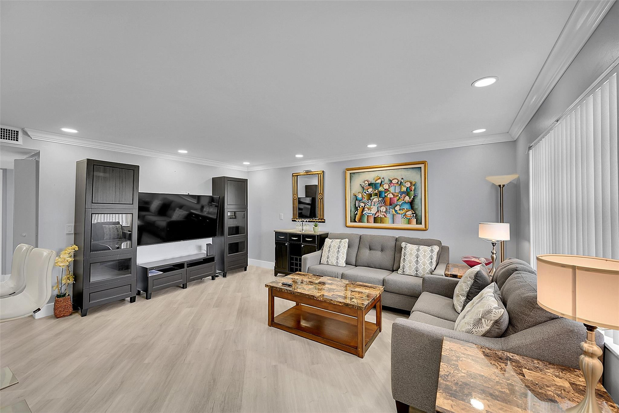 Beautifully renovated ground-floor 2BR/2BA condo with modern finishes throughout. Features include newer vinyl laminate flooring, LED high-hat lighting, and a fully updated kitchen with white shaker cabinets, quartz countertops, and new stainless-steel appliances. Both bathrooms have been completely updated. Enjoy a private screened porch with washer and dryer included. Incredible golf course views from the living area. Side entrance offers quick access to your assigned parking space. Kings Point offers true resort-style living with indoor/outdoor pools, theater, gym, bistro, café, two golf courses, courtesy buses and more. Perfect 55+ community lifestyle. This property is a must-see!